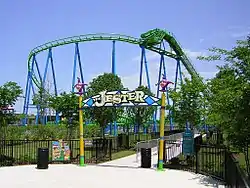Six Flags took over the lease of Jazzland in 2002, operating it as "Jazzland" for the 2002 season, before changing the park's name in 2003 to Six Flags New Orleans[5] for the 2003 season. Before the 2003 season, the park opened a whole new selection of rides including moving The Joker's Revenge roller coaster from Fiesta Texas in San Antonio to the park in New Orleans and renamed it The Jester in the Mardi Gras section of the park.[6] The coaster, which still ran backwards, was given a new color scheme of Green and Blue.