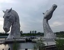The Kelpies are 30-metre-high (98 ft) horse-head sculptures depicting kelpies (shape-shifting water spirits), located between Falkirk and Grangemouth,[1] standing next to a new extension to the Forth and Clyde Canal, and near River Carron, in The Helix, a new parkland project built to connect 16 communities in the Falkirk Council Area, Scotland.[2] The sculptures were designed by sculptor Andy Scott and were completed in October 2013.[3] The sculptures form a gateway at the eastern entrance to the Forth and Clyde canal, and the new canal extension built as part of The Helix land transformation project. The Kelpies are a monument to horse-powered heritage across Scotland.[4]