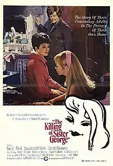 The Killing of Sister George is a 1968 American black comedy film directed by Robert Aldrich and filmed at his Aldrich Studios in Los Angeles. It is based on the 1964 play by British playwright Frank Marcus. In the film, an aging lesbian television actress, June "George" Buckridge (Beryl Reid, reprising her role from the stage play), simultaneously faces the loss of her popular television role and the breakdown of her long-term relationship with a younger woman (Susannah York). Although Marcus's play was a black comedy,[4] the film version was marketed as a "shocking drama";[5] it added explicit lesbian content that was not in the original play,[6] and was presented as a serious treatment of lesbianism.[7]