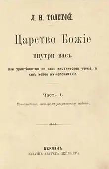 The Kingdom of God Is Within You (pre-reform Russian: Царство Божіе внутри васъ; post-reform Russian: Царство Божие внутри вас, tr. Tsárstvo Bózhiye vnutrí vas) is a non-fiction book written by Leo Tolstoy. A Christian anarchist philosophical treatise, the book was first published in Germany in 1894 after being banned in his home country of Russia.[1] It is the culmination of 30 years of Tolstoy's thinking, and lays out a new organization for society based on an interpretation of Christianity focusing on universal love.