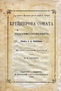 The Kreutzer Sonata (Russian: Крейцерова соната, Kreitzerova Sonata) is a novella by Leo Tolstoy, named after Beethoven's Kreutzer Sonata. The novella was published in 1889, and was promptly censored by the Russian authorities. The work is an argument for the ideal of sexual abstinence and an in-depth first-person description of jealous rage. The main character, Pozdnyshev, relates the events leading up to his killing of his wife: in his analysis, the root causes for the deed were the "animal excesses" and "swinish connection" governing the relation between the sexes.