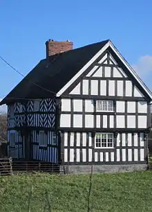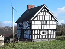 A farmhouse dating from the later part of the 16th century with later additions and alterations. Timber framed with plaster and painted brick infill and a slate roof. It has a lobby-entrance of "Severn Valley"[2] type with the doorway leading into a lobby set against the centrally placed chimney stack. The house consists of four framed bays, with one to the left of the entrance. It is two storied house of transitional or ‘‘sub-medieval’’ form with a jettied first floor with a richly moulded bressumer supported on decorated carved brackets.
