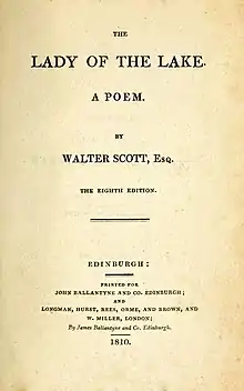 The first edition of The Lady of the Lake was published on 8 May 1810 in Edinburgh by John Ballantyne and Co. and in London on 16 May by Longman, Hurst, Rees, and Orme, and William Miller. The price was two guineas (£2 2s or £2.10), and 2000 copies were printed.[10] Several more editions followed in the same year, and in 20 February Scott informed John Leyden that 'no less than 25,000 copies have disappeared in eight months and the demand is so far from being abated, that another edition of 3000 is now at press'.[11]