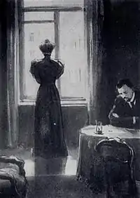 Returning to Moscow, to his loveless marriage and his daily routine, working by day and socializing by night, Gurov expects to soon forget young Anna, but to his surprise, her memory haunts him. Unexpectedly, he fell deeply in love for the first time, after many affairs and just as he is approaching middle age. He feels that he must see Anna, despite the obvious complications. On the ruse of going to St. Petersburg to attend to personal business, he sets off to Anna's hometown to find her. Learning the location of the family's residence from a hotel porter, he finds the house, only to realize that it would be unwise to intrude. In despair, he rationalizes that Anna has probably forgotten him and found someone else, and heads back to his hotel.