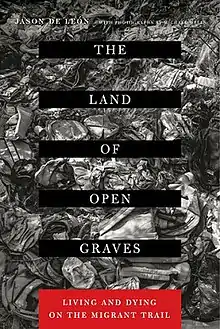 The Land of Open Graves is a book by anthropologist Jason De León with photographs by Michael Wells.[1] The book examines the human consequences of United States immigration policy. Using research methods from all four subfields of anthropology, De León sheds light on the lives (and deaths) of the thousands of migrants who cross the US border with Mexico daily in the Sonoran Desert of Arizona. The book was published in hardcover and paperback by the University of California Press in 2015 as part of the California Series in Public Anthropology.