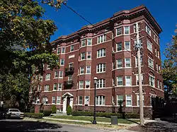 The Lexington, also known as Lexington Apartments, is a historic building located in Des Moines, Iowa, United States. The five-story brick structure on a raised basement was completed in 1908 as the city's first high-rise apartment building.[2] It was designed and built by local architect-builder Fred Weitz. The exterior features a Colonial Revival style entrance with a recessed door, arched fanlight, and engaged Doric style columns that support the pediment. Wrought iron balconies are located on the two floors above the entrance. On the interior there are two apartments on every floor, and they originally featured servant's quarters.[2] They have subsequently been converted into other purposes. The upper floors are served by a large, open-cage brass elevator. The building purportedly had paranormal activity involving its elevator.[3] It was renovated between 2012 and 2014. It was individually listed on the National Register of Historic Places in 1976.[1] The building was included as a contributing property in the Sherman Hill Historic District in 1979.[4] It is currently owned by the Allen Family Trust.