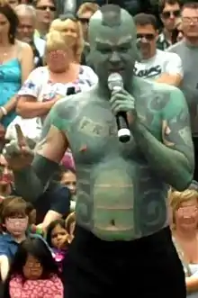 Erik Sprague (born June 12, 1972),[1] known professionally as the Lizardman, is an American freak show and sideshow performer. He is best known for his body modification, including his sharpened teeth, full-body tattoo of green scales, bifurcated tongue, subdermal implants and green-inked lips.