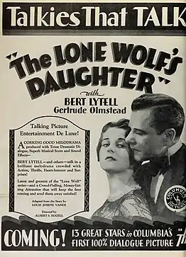The Lone Wolf's Daughter is a lost[1][2] 1929 feature silent film with talking sequences, music and sound effects. It was directed by Albert S. Rogell and stars Bert Lytell. It was produced and distributed by Columbia Pictures.[3][4]