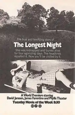 The Longest Night is a 1972 American made-for-television drama film written by Merwin Gerard and directed by Jack Smight.[1] This movie was originally shown as an ABC Movie of the Week on September 12, 1972. It is based on the 1968 Barbara Mackle kidnapping by Gary Steven Krist.[2]