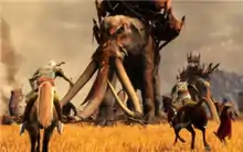 The graphics and animations of the game were considered substandard. GamesRadar+ chastised the game as presenting "a band of wooden-legged freaks who moonwalk like the Former King of Pop [...] the gimpiest horses since Two Worlds," and likened some of the creature character models to "claymation diarrhea."[19] IGN stated that "friend and foe alike blend into one messy brown blur".[20] GameSpy called the graphics "lackluster" and the environments "bland", feeling that the backgrounds were lacking in detail.[18] Some reviewers also complained about the lack of enemies on screen, CVG saying that the "cardboard cut-outs in the background" were the most exciting part of a battle.[15][22]