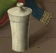 The Magdalen's ointment jar was common in the lexicon of art in van der Weyden's period. Mary of Bethany may have used a jar when she repented of her sins at Christ's feet in her home; by the Renaissance, the image of the Magdalen was of the woman who bathed Christ's feet with her tears and dried them with her hair.[41] She signified the "sacrament of anointing (Chrism and Unction)" by pouring precious spikenard on Christ's feet at his tomb.[42]