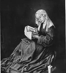 The Magdalen Reading is one of three surviving fragments of a large mid-15th-century oil-on-panel altarpiece by the Early Netherlandish painter Rogier van der Weyden. The panel, originally oak, was completed some time between 1435 and 1438 and has been in the National Gallery, London since 1860. It shows a woman with the pale skin, high cheek bones and oval eyelids typical of the idealised portraits of noble women of the period.[2] She is identifiable as the Magdalen from the jar of ointment placed in the foreground, which is her traditional attribute in Christian art. She is presented as completely absorbed in her reading, a model of the contemplative life, repentant and absolved of past sins. In Catholic tradition the Magdalen was conflated with both Mary of Bethany who anointed the feet of Jesus with oil[3] and the unnamed "sinner" of Luke 7:36–50. Iconography of the Magdalen commonly shows her with a book, in a moment of reflection, in tears, or with eyes averted.