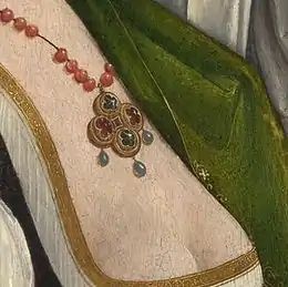 The woman can be identified as Mary Magdalen from the jar of oil held in her hand; her traditional attribute in 15th and 16th century northern European art. The jar, depicted in fine detail, seems to be made from a precious blue stone, delicately carved and mounted in gold.[4] The Magdalen is shown with very elegant and beautiful facial features, brown eyes and shallow pale skin, and is dressed in finely embroidered clothes. She wears a white patterned cap over her strawberry-blond hair. The cap is covered by two white veils; one semi-transparent, the other opaque white. Infra-red photography reveals a number of preparatory underdrawings. Samples of the pigments show that three different purples were used; formed from mixtures of lead white, azurite and red lake, however most passages of purple have either faded or been overpainted by restorers.[5]