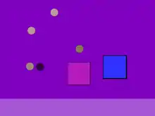 The player interacts using only mouse movement, hovering over abstract shapes. The player's actions or inaction enlarge or shrink pink and blue squares, increase or decrease their opacity, and move them towards or away from each other.[2][3] Placing the cursor over either of the squares causes the blue square to shrink, and for the squares to move towards each other. Moving the cursor over a circle makes the circle disappear, while at the same time reducing the size of the pink square. If the two squares "kiss" by touching edges, the sizes and transparency are affected inversely: the blue square shrinks and becomes more transparent; the pink square grows and becomes more opaque. When the blue square comes in contact with circles of any color other than black, it grows and becomes more opaque. When the pink square comes in contact with circles of any color other than black, it grows but transparency does not change. When either square collides with a black circle, its size decreases. As squares collide with each other or with circles, a light bar at the bottom of the screen grows in size. Over time, the pink square steadily increases its transparency unless counteracted by touching edges with the blue square.[2][4]