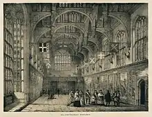 According to the report of Dudley Carleton,[22] the masque was staged at night after a performance of a Robin Goodfellow play, probably A Midsummer Night's Dream.[23][24] The scene opened with Heaven, built in the hall, from where a Chinese magician made a long speech describing his country, comparing it "for strength and plenty" with England.[25] He announced the arrival of "certain Indian and China knights", who he had magically conveyed on clouds to Hampton Court. A curtain or "traverse" was pulled back to reveal the masquers playing the knights and carrying torches and lanterns. After some songs, the masquers approached the king in turn.[26]