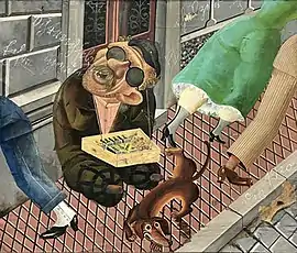 The Match Seller (German: Streichholzhändler) is a 1920 painting by the German Dada and Neue Sachlichkeit artist Otto Dix. The composition depicts a scene where a homeless and crippled war veteran is seen selling matches on a street in Germany. Several well-dressed passersby flee from the quadrupled and blind amputee, while a dachshund, with its gaze turned toward the viewer, urinates on the veteran's peglegs. As others ignore him, the veteran cries out the phrase “Matches, original Swedish matches!” (German: “Streichhölzer, Echte Schwedenhölzer") written on the composition using white lettering.[1]