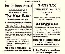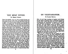 The Meat Fetish: Two Essays on Vegetarianism was then published by the Public Publishing Company, at the First National Bank Building, in Chicago, Illinois. It was described as an "interesting and comprehensive primer on vegetarianism" in an advertisement taken out in the periodical Land and Freedom. The advertisement column also directs the reader to "Send the Packers Packing! Why eat filth when it is quite unnecessary? Learn to do without by reading The Meat Fetish."[14] The identical advertisement also appears in the periodicals Single Tax Review, as well as The Public. In 1907, the cost for one copy of The Meat Fetish pamphlet was post-free with 10 cents of postage stamps, or twelve copies for 1 dollar with postage paid.[14]