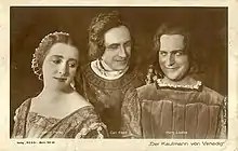 The Merchant of Venice (German: Der Kaufmann von Venedig) is a 1923 German silent drama film directed by Peter Paul Felner and starring Werner Krauss, Henny Porten and Harry Liedtke. The film is an adaptation of William Shakespeare's play The Merchant of Venice. It was released in the United States in 1926 as The Jew of Mestri.[1] The film was made on location in Venice, with scenes and characters added which were not in the original play. This is the surviving copy, being two reels shorter than the German version. The characters in the German retained Shakespeare's nomenclature, but in the American they were given new names sourced from the Italian work Il Pecorone, a 14th-century short story collection attributed to Giovanni Fiorentino, from which Shakespeare is believed to have drawn his idea. The film purports to be a return to the original, as an excuse for its differences from the play.