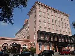 Construction of the new hotel began on April 3, 1969.[8] The hotel was designed by the New York-based firm of Curtis and Davis, with the Ruscon Construction Company as the general contractor, and local architects Simons, Lapham, Mitchell and Small consulting on exterior design and historic details. The original 79-foot iron balcony across the front was replaced with a 75-foot version, and some changes were made to the window cornices (the cornices on the first two floors were cast from originals, but upper floors received different cornices that the original).[9] The chandelier in the Meeting Street lobby was acquired from Belle Meade Plantation, a Nashville, Tennessee house that was designed by William Strickland.[10]