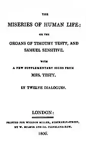 The Miseries of Human Life was written by James Beresford (1764–1840) and published in 1806, first as a single volume and then as an expanded two-volume edition later that year. Illustrated by George Cruikshank, it catalogued "in excruciating detail" the "petty outrages, minor humiliations, and tiny discomforts that make up everyday human existence". The Miseries were written as a series of discussions between Mr Samuel Sensitive and Mr Timothy Testy, in which they catalogue the daily "injuries, insults, disappointments and treacheries" of everyday life. Mrs Testy makes occasional appearances to offer "Supplementary Sighs" from a feminine perspective.[1]