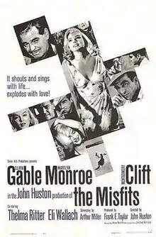 The Misfits is a 1961 American western film written by Arthur Miller, directed by John Huston, and starring Clark Gable, Marilyn Monroe, and Montgomery Clift. The supporting cast features Thelma Ritter, Eli Wallach and Kevin McCarthy. Adapted by Miller from his own short story of the same name published in Esquire in October 1957,[3] The Misfits was the last completed film for both Clark Gable and Marilyn Monroe. For Gable, the film was posthumously released, while Monroe died in 1962. The plot centers on a newly divorced woman (Monroe) and her time in Reno and Northern Nevada, spent with her friendly landlady Isabelle Steers (Thelma Ritter), an old-school cowboy (Gable), the cowboy's tow truck-driving and plane-flying friend (Wallach) and their rodeo-riding, bronc-busting friend (Clift) in Dayton, Nevada, and in the western Nevada desert in 1960.