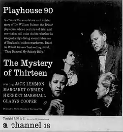 "The Mystery of Thirteen" was an American television play broadcast in 1957 as part of the CBS television series Playhouse 90. Jack Lemmon starred as the notorious English physician, William Palmer, who was suspected of 13 murders and was hanged in 1856 for poisoning a close friend. Margaret O'Brien co-starred, David Shaw wrote the teleplay, and Robert Mulligan directed.