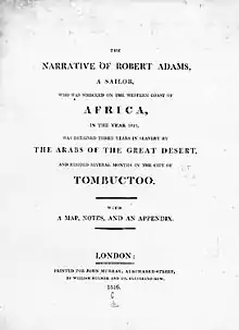 The Narrative of Robert Adams is a memoir by American sailor Robert Adams first published in 1816. The narrative is the story of the adventures of Adams, then a twenty-five-year-old American sailor who claimed to be enslaved in North Africa for three years, from 1810 to 1814, after surviving a shipwreck. He was said to have finally been ransomed by the British Consul, where he eventually made his way to London. It was there that, as a random beggar on the streets, he was "discovered" by the Company of Merchants Trading to Africa, where he narrated the full details of his adventure.[1][2][3]