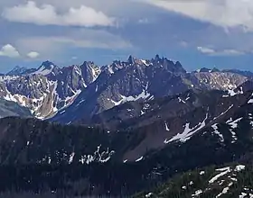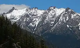 During the Pleistocene period dating back over two million years ago, glaciation advancing and retreating repeatedly scoured the landscape leaving deposits of rock debris.[4] The "U"-shaped cross section of the river valleys are a result of recent glaciation. Uplift and faulting in combination with glaciation have been the dominant processes which have created the tall peaks and deep valleys of the North Cascades area.