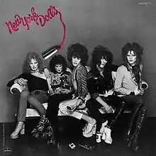 In 1971, vocalist David Johansen formed the New York Dolls with guitarists Johnny Thunders and Rick Rivets, bassist Arthur Kane, and drummer Billy Murcia; Rivets was replaced by Sylvain Sylvain in 1972.[1] The band was meant to be a temporary project for the members, who were club-going youths that had gone to New York City with different career pursuits. As Sylvain recalled, "We just said 'Hey, maybe this will get us some chicks.' That seemed like a good enough reason." He and Murcia originally planned to work in the clothing business and opened a boutique on Lexington Avenue that was across the street from a toy repair shop called the New York Doll Hospital, which gave them the idea for their name.[2] The group soon began playing regularly in lower Manhattan and earned a cult following within a few months with their reckless style of rock music. Nonetheless, record companies were hesitant to sign them because of their onstage cross-dressing and blatant vulgarity.[1]