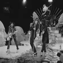 New York Dolls was released on July 27, 1973, in the United States and on October 19 in the United Kingdom.[38] Its controversial cover featured the band dressed in exaggerated drag, including high wigs, messy make-up, high heels, and garters.[22] The photo was used for shock value, and on the back of the album, the band is photographed in their usual stage wear.[39] To announce the album's release, Mercury published an advertisement slogan that read "Introducing The New York Dolls: A Band You're Gonna Like, Whether You Like It Or Not", while other ads called them "The Band You Love to Hate".[40] Two double A-sided, 7-inch singles were released – "Trash" / "Personality Crisis" in July and "Jet Boy" / "Vietnamese Baby" in November 1973 – neither of which charted.[41]