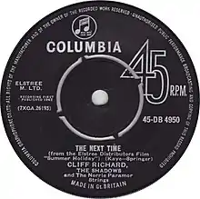 "The Next Time" backed with "Bachelor Boy" was the first of three number one hit singles from the Cliff Richard musical, Summer Holiday.[1] Both sides were marketed as songs with chart potential, and the release is viewed retroactively as a double A-side single. However, technically double A-sides were not regarded as such until 1965, so "The Next Time" was pressed as the A-side,[2] with "Bachelor Boy" the B-side (written by Bruce Welch and Cliff Richard). The song was succeeded at number one by The Shadows' "Dance On!".[1]