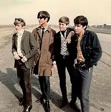 The Novas were made up of members from Dallas and Fort Worth, Texas and formed in 1963 when guitarists John Salih and David Browne began playing as a duo, eventually expanding into a combo by adding Mike Mullen on bass and Gary Madrigal on drums.[1][2] They adopted the name the Novas, taken after the popular compact-sized automobile of the time, the Chevrolet Nova.[2][3][4] The band specialized in playing popular surf rock instrumentals of the day made popular by acts such a s the Ventures, the Surfaris, and the Astronauts and did some vocal numbers by Chuck Berry as well as "Louie Louie" by the Kingsmen.[2] They made their first impression at a Junior High School talent show when they were cheered on by screaming girls, in similar fashion to the euphoria surrounding the Beatles' recent inaugural visit to the United States in February 1964.[2] They became the most popular band at their school and eventually in the Dallas/Fort Worth area.[1][2] They eventually developed a sound which included rich vocal harmonies, which enabled them to do songs that most bands could not do and earned them a reputation as having the best harmonies of any rock band in North Texas.[2] The Novas used black 1950s model Cadillac hearse with their band's logo painted on the side to travel from gig to gig and carry their equipment.[2] The band played at popular clubs in the Dallas and Fort Worth area.[3][4] Several establishments were teen clubs such as Panther Hall, Teen a Go Go, the Action a Go Go, as well as the infamous adult strip club the Cellar, which clandestinely allowed teenage groups to perform.[3]
