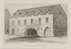 The Old Mill, Ruthin, Denbighshire, North Wales was designated Grade II listed building on the 24 October 1950; the mill probably dates from around 1300. The Warden of Ruthin, the early 19th century, Archdeacon Newcome, noted that the building had been used as a garrison chapel. There are two early English pointed arches and one gable end has a blocked lancet window, with a sunken cross above. The watermill was removed from the mill during the 1950s and Mill St runs to the side of the old mill.[1]