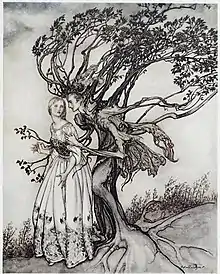 ![]() "Suddenly the branches twined round her and turned into two arms." Illustration by Arthur Rackham, 1917 | |