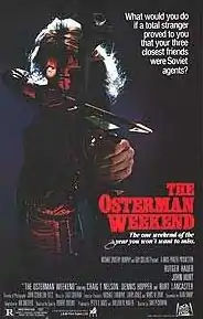 The Osterman Weekend is a 1983 American suspense thriller film directed by Sam Peckinpah, based on the 1972 novel of the same name by Robert Ludlum. The film stars Rutger Hauer, John Hurt, Burt Lancaster, Dennis Hopper, Meg Foster, Helen Shaver, Chris Sarandon and Craig T. Nelson. It was Peckinpah's final film before his death in 1984.