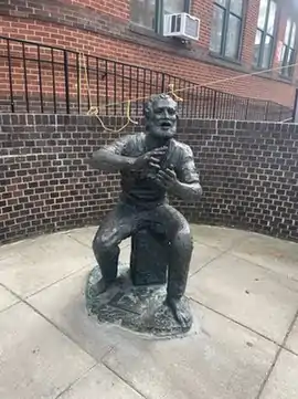 The bronze sculpture shows a man seated on a large cinder block and at his feet is a carpenter's square. Dressed in only a shirt and pants, his shirt sleeves are rolled up above his elbows and his collar is open. His face wears a beard and mustache and his feet are shoe-less. His arms reach out in front of him, and he looks as if in conversation.[1]