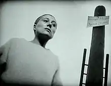 Dreyer often shot the priests and Joan's other interrogators in high contrast lighting, but then shot Joan in soft, even lighting.[17] Rudolph Maté's high-contrast cinematography also allowed unappealing details in people's faces, such as warts and lumps, to be fully visible. In addition, Dreyer employed many low-angle shots of Joan's persecutors so that they would appear more monstrous and intimidating; in the effort to do this, several holes were dug on the set for the camera to film from the appropriate angle, causing the crew to nickname him "Carl Gruyére".[6] Dreyer also shot the film "from the first to the last scene ... in the right order."[16]
