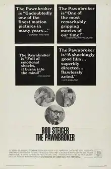 The Pawnbroker is a 1964 American drama film directed by Sidney Lumet, starring Rod Steiger, Geraldine Fitzgerald, Brock Peters and Jaime Sánchez. The screenplay was an adaptation by Morton S. Fine and David Friedkin from the novel of the same name by Edward Lewis Wallant.