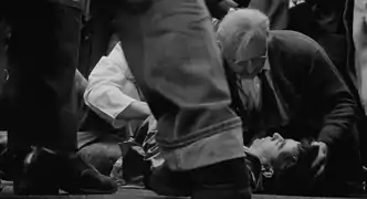 The scenes resulted in conflict with the Motion Picture Association of America, which administered the Motion Picture Production Code. The Association initially rejected the scenes showing bare breasts and a sex scene between Sanchez and Oliver, which it described as "unacceptably sex suggestive and lustful." Despite the rejection, Landau arranged for Allied Artists to release the film without the Production Code seal, and New York censors licensed The Pawnbroker without the cuts demanded by Code administrators. On a 6-3 vote, the Motion Picture Association of America granted the film an "exception" conditional on "reduction in the length of the scenes which the Production Code Administration found unapprovable." The exception to the code was granted as a "special and unique case," and was described by The New York Times at the time as "an unprecedented move that will not, however, set a precedent."[11] The requested reductions of nudity were minimal, and the outcome was viewed in the media as a victory for the film's producers.[5]