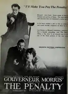 The Penalty is an American psychological thriller crime film starring Lon Chaney and originally released in 1920 by Goldwyn Pictures. The movie was directed by Wallace Worsley, and written by Philip Lonergan and Charles Kenyon, based upon the pulp novel by Gouverneur Morris. The supporting cast includes Charles Clary, Doris Pawn, Jim Mason, and Claire Adams.[1] The copyright for the film was owned by Gouverneur Morris, who wrote the novel on which the film was based.