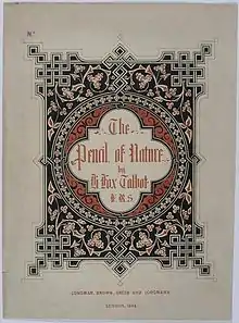 The cover page for The Pencil of Nature clashed designs, which was characteristic of the Victorian era, with styles inspired by baroque, Celtic, and medieval elements.[7] Its symmetrical design, letterforms, and intricate carpet pages are similar to and a pastiche of the Book of Kells.
