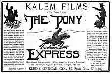 The Pony Express is an American silent film produced by Kalem Company and directed by Sidney Olcott with Sidney Olcott, Robert Vignola and Joe Santley in the leading roles.