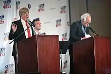 Atamanuik began impersonating Trump during the 2016 United States presidential campaign. His first efforts were improvisations with the Upright Citizens Brigade in August 2015.[25] In a subsequent sketch series called Trump vs. Bernie, Atamanuik challenged James Adomian, who played Bernie Sanders, in mock debates. The two toured the United States and appeared on television. They went on Comedy Central's @midnight in March 2016, and had a one-hour sketch special on Fusion in May 2016.[26] Atamanuik also appeared by himself as Trump on several shows during the campaign, including @midnight, The Chris Gethard Show[27] and The View.[28]