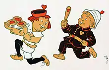 The poem's story is retold in a much expanded form in an 1805 poem known as King and Queen of Hearts: with the Rogueries of the Knave who stole the Queen's Pies[4] by Charles Lamb, which gives each line of the original, followed by a poem commenting on the line.[6] In 1844 Halliwell included the poem in the 3rd Edition of his The Nursery Rhymes of England (though he dropped it from later editions) and Caldecott made it the subject of one of his 1881 "Picture Books", a series of illustrated nursery rhymes which he normally issued in pairs before Christmas from 1878 until his death in 1886.[4]