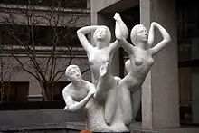The sculpture was carved in Carrara, Italy, from a single 200-ton block of white Pentelic marble, quarried near Athens.[3] It depicts five "larger than life" nude figures, including three females, one male and one child.[5][6] The statue is set on a pedestal within a fountain, surrounded by water jets.[3] The figures' forms curve upward, and two of the females have their hands raised, while the third "sleeps in the rear".[5] The male figure appears to float and is reaching up with both hands, while the child figure is located behind the foremost female.[5]