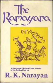 The Ramayana is a mythological book by R. K. Narayan. It was first published by Chatto and Windus, London in 1972.[1] The book is a shortened, prose adaptation of the Tamil Kamba Ramayanam.[2] In 1938, Narayan made a promise to his dying uncle that he would translate the Kamba Ramayana to English, however, he did not think about this promise until 1968 when he began work on this effort.[3] He later wrote The Mahabharata, published in 1978.