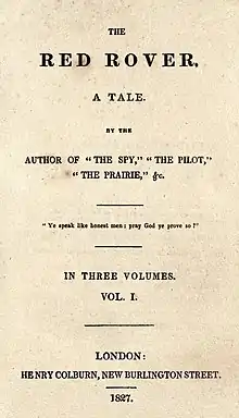 The Red Rover is a novel by American writer James Fenimore Cooper. It was originally published in Paris on November 27, 1827, before being published in London three days later on November 30. It was not published in the United States until January 9, 1828, in Philadelphia. In the same year, it was translated and published in Germany under the name Red Rover.[1] Soon after its publication it was adapted for theater both in the United States and in England.[2]
