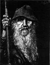 After Wotan seizes the ring from the captive Alberich, the dwarf's agonised, self-pitying monologue ("Am I now free?") ends with his declamation of the "Curse" motif – "one of the most sinister musical ideas ever to have entered the operatic repertoire", according to Scruton's analysis: "It rises through a half-diminished chord, and then falls through an octave to settle on a murky C major triad, with clarinets in their lowest register over a timpani pedal in F sharp".[107] This motif will recur throughout the cycle; it will be heard later in this scene, when Fafner clubs Fasolt to death over possession of the ring.[108] Tranquil, ascending harmonies introduce the reconvention of the gods and giants.[109] The subsequent dispute over Wotan's reluctance to part with the ring ends with Erda's appearance; her motif is a minor-key variation of the "Nature" motif from the prelude.[110] After her warning she departs to the sounds of the "Downfall" motif, an inversion of Erda's entry that resembles "Woman's Worth".[110][26] The scene ends with a rapid succession of motifs: "Donner's Call", a horn fanfare by which he summons the thunderstorm; Froh's "Rainbow Bridge" which provides a path for the gods into Valhalla;[111] the "Sword" motif, a C major arpeggio that will become highly significant in later Ring operas,[112] and the haunting "Rhinemaidens' Lament", developed from the falling step which earlier signified the maidens' joy in the gold.[113] Scruton writes of this lament: "And yet, ever sounding in the depths, is the lament of the Rhine-daughters, singing of a natural order that preceded the conscious will that has usurped it. This lament sounds in the unconsciousness of us all, as we pursue our paths to personality, sovereignty and freedom...".[114][n 7] These are the last voices that are heard in the opera, "piercing our hearts with sudden longing, melting our bones with nostalgic desire",[116] before the gods, "marching in empty triumph to their doom",[112] enter Valhalla to a thunderous orchestral conclusion, made up from several motifs including "Valhalla", "Rainbow Bridge" and the "Sword".[113]