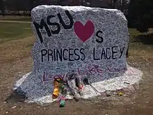 On Wednesday, April 9, 2014, at 9:00 pm, hundreds gathered at the rock to hold a vigil for Lacey Holsworth, dubbed "Princess Lacey", a young 8-year-old girl, with terminal cancer, who befriended the MSU Basketball team and whose story was a source of inspiration nationwide. The rock was painted white, with "MSU Loves Princess Lacey" on the front, and "Love Like Lacey" on the base. Students then proceeded to sign the rock with a black sharpie, leaving their own personal messages to Lacey, who had passed that morning. Throughout Thursday, dozens of students an hour stopped at the rock, adding their names, leaving flowers, and paying their respects. A movement, highlighted by an article in the Detroit News, sought to ban all future painting of the rock, and to preserve it as a permanent memorial to Lacey.[2] But by April 21, 2014, four days after her memorial, it was repainted with the message "Congratulations graduates, be a hero to someone" marking the longest period, in recent history, that the rock had gone unchanged.