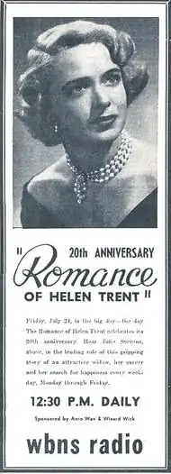 The Romance of Helen Trent was a radio soap opera which aired on CBS from October 30, 1933 to June 24, 1960 for a total of 7,222 episodes. The show was created by Frank and Anne Hummert, who were among the most prolific producers during the radio soap era.[1]